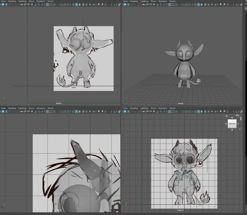 - From this concept create a “turn around” of your character showing front side and back views of your character. Separate any assets like weapons, or key character items to one side of the turn around like shown in the example. ensure all views have equal proportions and sizes.